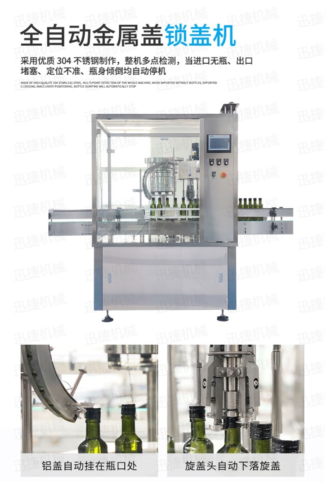 該部分利用鏈板輸送帶將瓶子依次輸送至定位卡盤,自動檢測瓶,當被鎖口(或旋蓋)瓶到達落蓋滑道正下方工位時,鋁蓋自動掛在瓶口處。瓶子由旋轉卡盤輸送至打蓋裝置工位時,打蓋裝置將瓶蓋及內塞打緊,再由旋轉卡盤將瓶子輸送至旋蓋工位,旋蓋頭自動下落旋蓋、鎖螺紋,再由旋轉卡盤將鎖蓋輸送至直線輸送帶上,從而完成整個工序;