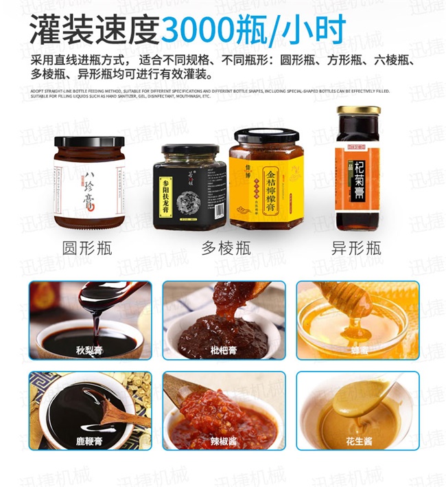 枇杷膏自動灌裝機生產流水線適用于各種1、各種膏滋如:秋梨膏、枇杷膏、鹿鞭膏、蜂蜜等的灌裝。2、調味醬如:香菇醬、辣椒醬、豆瓣醬、花生醬、芝麻醬、牛油火鍋底料、紅油火鍋底料。3、采用多規格的灌裝轉閥、灌裝頭,可適應不同客戶物料的灌裝需求。