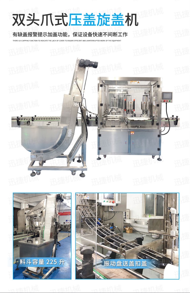 該枇杷膏灌裝機生產線-上蓋機結合用戶使用的情況,摒棄了傳統轉盤式真空旋蓋機的弊端,研制開發的新型設備,設備自動檢測到設定數量的瓶子、蓋子進入到真空旋蓋機內,旋蓋機彩色顯示屏會實時顯現旋蓋狀況,整機多點檢測,當進口無瓶無蓋、出口堵塞、定位不準、瓶身傾倒均自動停機。單個旋蓋頭達到的真空度都可以單獨顯示,單獨調整。合格率達到100%!