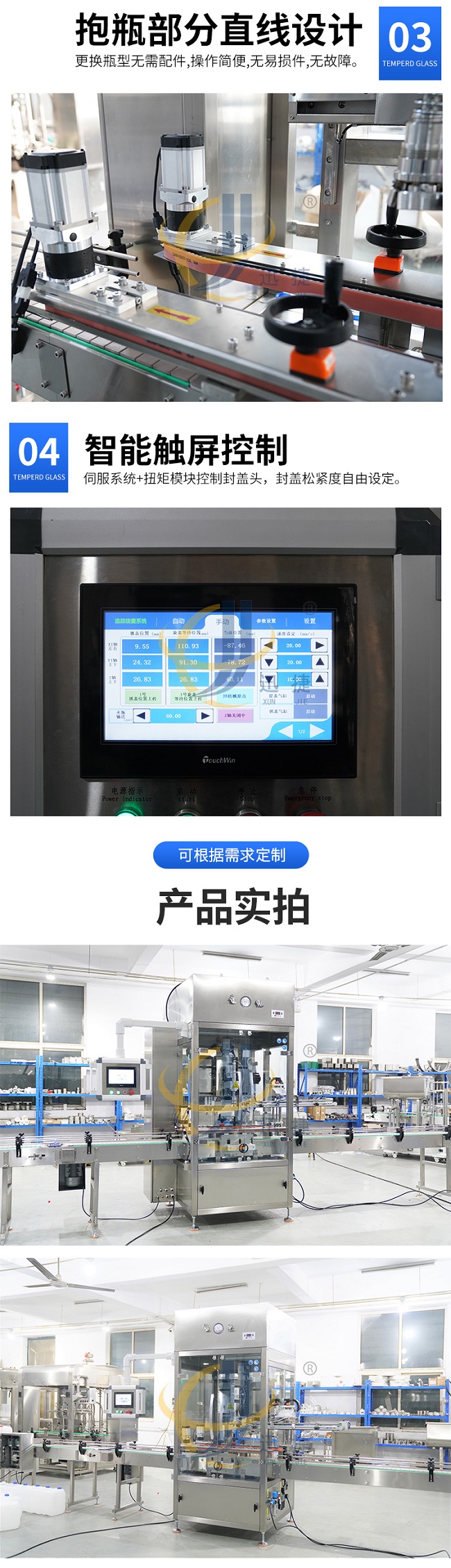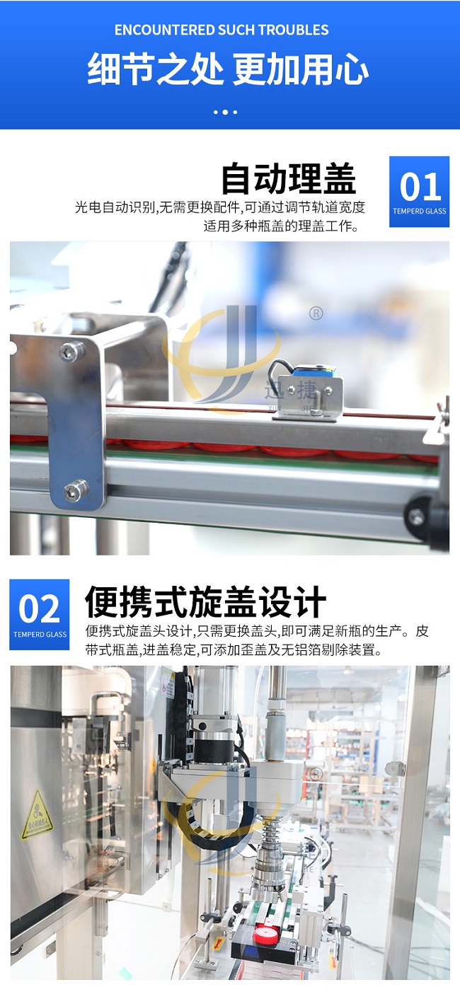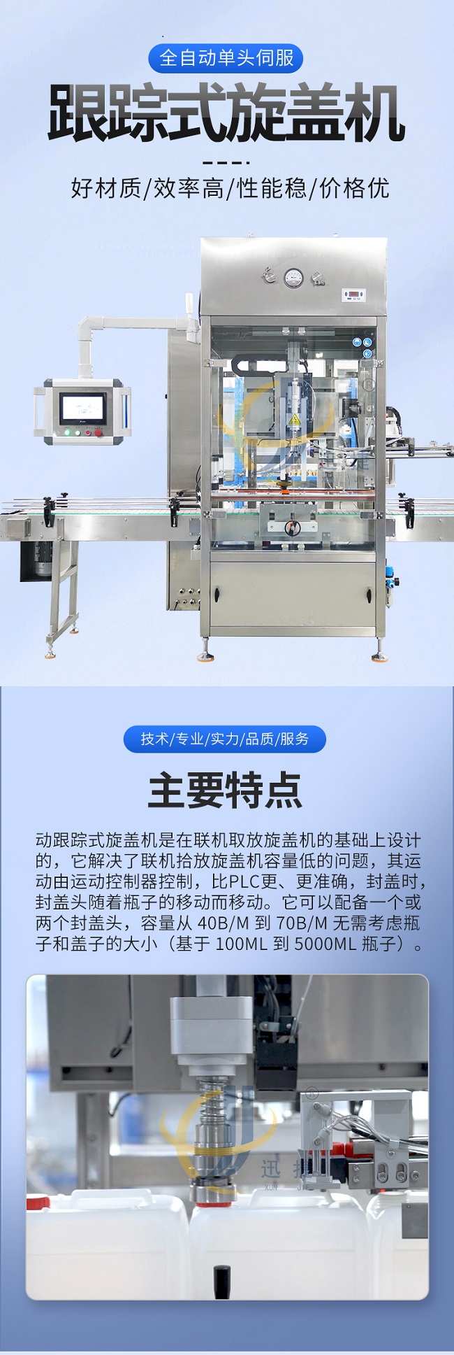 跟蹤式旋蓋機(jī)是在聯(lián)機(jī)取放旋蓋機(jī)的基礎(chǔ)上設(shè)計(jì)的,它解決了聯(lián)機(jī)拾放旋蓋機(jī)容量低的問題,其運(yùn)動(dòng)由運(yùn)動(dòng)控制器控制,比PLC更、更準(zhǔn)確,封蓋時(shí),封蓋頭隨著瓶子的移動(dòng)而移動(dòng)。它可以配備一個(gè)或兩個(gè)封蓋頭,容量從 40B/M 到70B/M 無需考慮瓶子和蓋子的大小(基于 100ML到5000ML瓶子)。