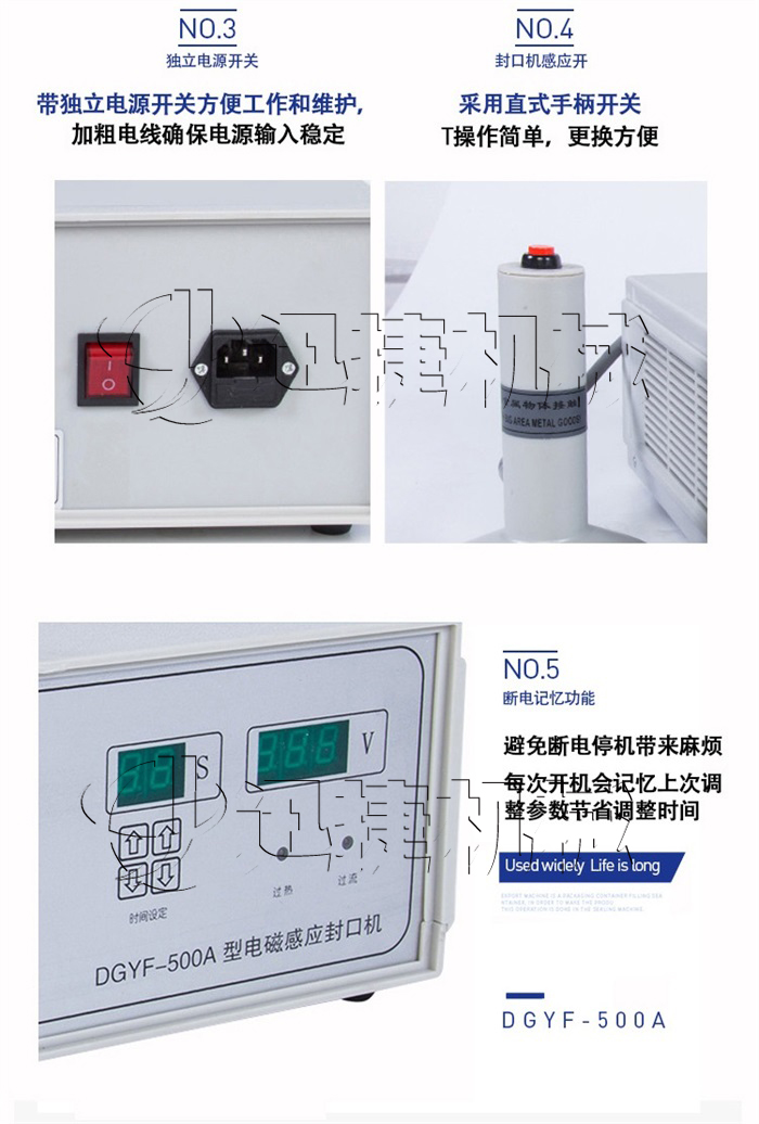 本手持式電磁感應鋁箔封口機是利用電磁感應的原理,將瓶口上的鋁箔片瞬間產生高熱,然后熔合在瓶口上,使達到封口的功能。具有良好的防潮、防霉、防偽作用,起到延長物品保存周期的目的。封口容器的材質可以是聚乙(PE)、聚丙烯(PP)、聚酯(PET)、聚苯乙烯(PS)、ABS以及玻璃等,不能用于金屬瓶體及瓶蓋。(本公司同時提供各種材料感應鋁箔膜)。
