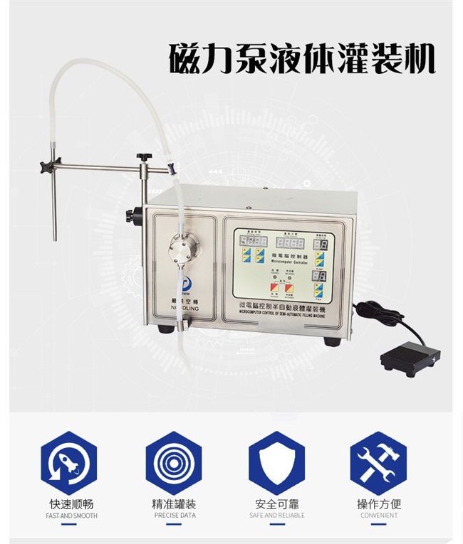 濟(jì)南迅捷設(shè)計(jì)生產(chǎn)的磁力泵灌裝機(jī)采用優(yōu)質(zhì)變頻調(diào)速器,配用進(jìn)口高精度多圈電位器及可鎖表盤,使流量調(diào)節(jié)穩(wěn)定準(zhǔn)確,誤差負(fù)偏小于0.5%,正偏小于0.5%。日本原裝進(jìn)口磁力齒輪不銹鋼泵,質(zhì)量可靠壽命長(zhǎng)。不銹鋼機(jī)箱,臺(tái)式款式,體積小,經(jīng)久耐用。操作方便,清洗消毒方便。功能全,自動(dòng)手動(dòng)均可。可配用在流水線上工作。可配多個(gè)灌裝頭,常用的型號(hào)有:?jiǎn)晤^磁力泵式灌裝機(jī),雙頭磁力泵灌裝機(jī),四頭磁力泵液體灌裝機(jī)。可灌充絕大多數(shù)類型的液體,包括高粘稠度的液體。如:各種藥劑、化學(xué)品、油類、化妝品、食品等無顆粒狀液體。灌充量從200ml-20000ml之間可調(diào),調(diào)節(jié)方便。